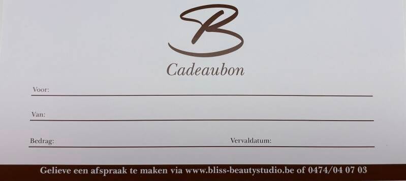 De cadeaubon kan ENKEL OP AFSPRAAK opgehaald worden bij Bliss Beauty Studio